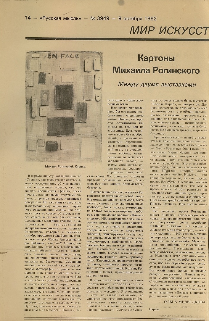 O. Medvekova, Kartony Mikhaila Roginskogo’ (Mikhail Roginsky’s Cardboards), Russkaya Mysl, 09.10.1992, 3949, Paris