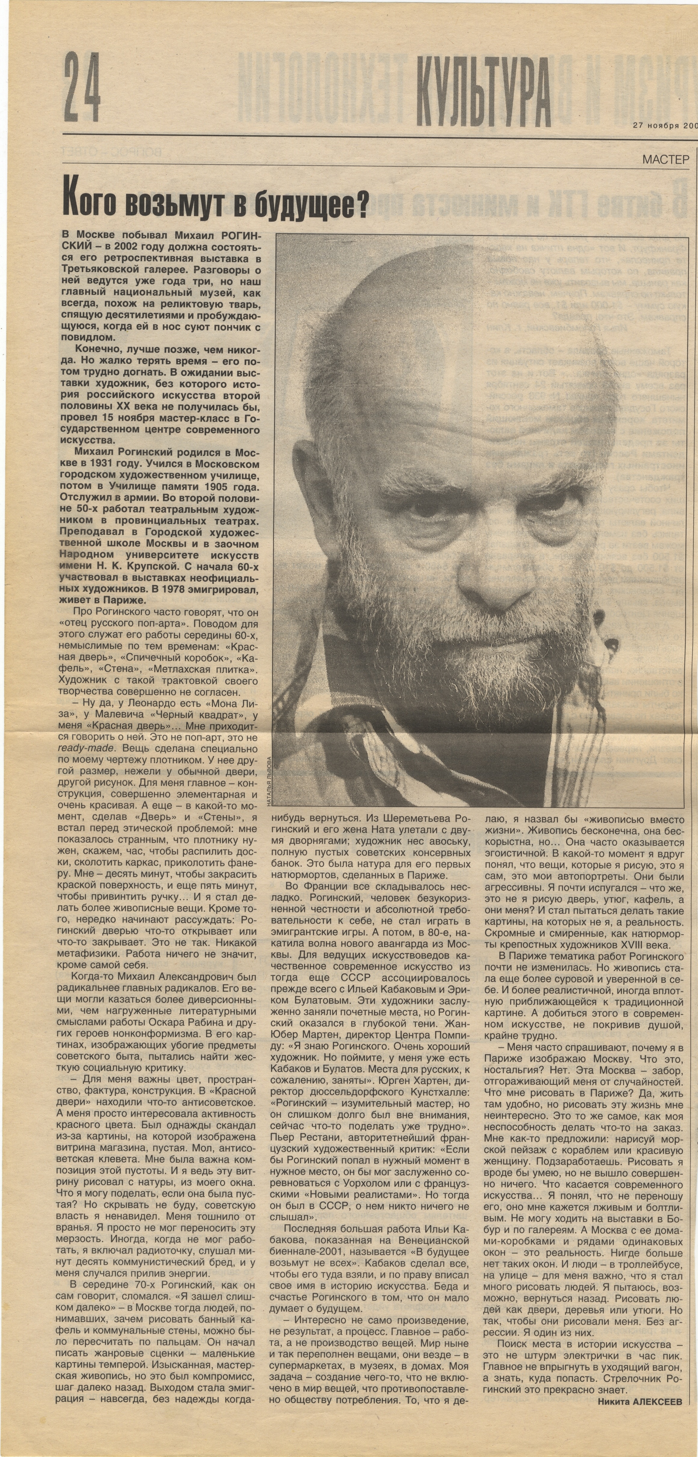 Nikita Alekseev, Kogo voz’mut v budushcheye? (Who Will They Take into the Future?) , Inostranets, 27.11.2001, 44, Moscow