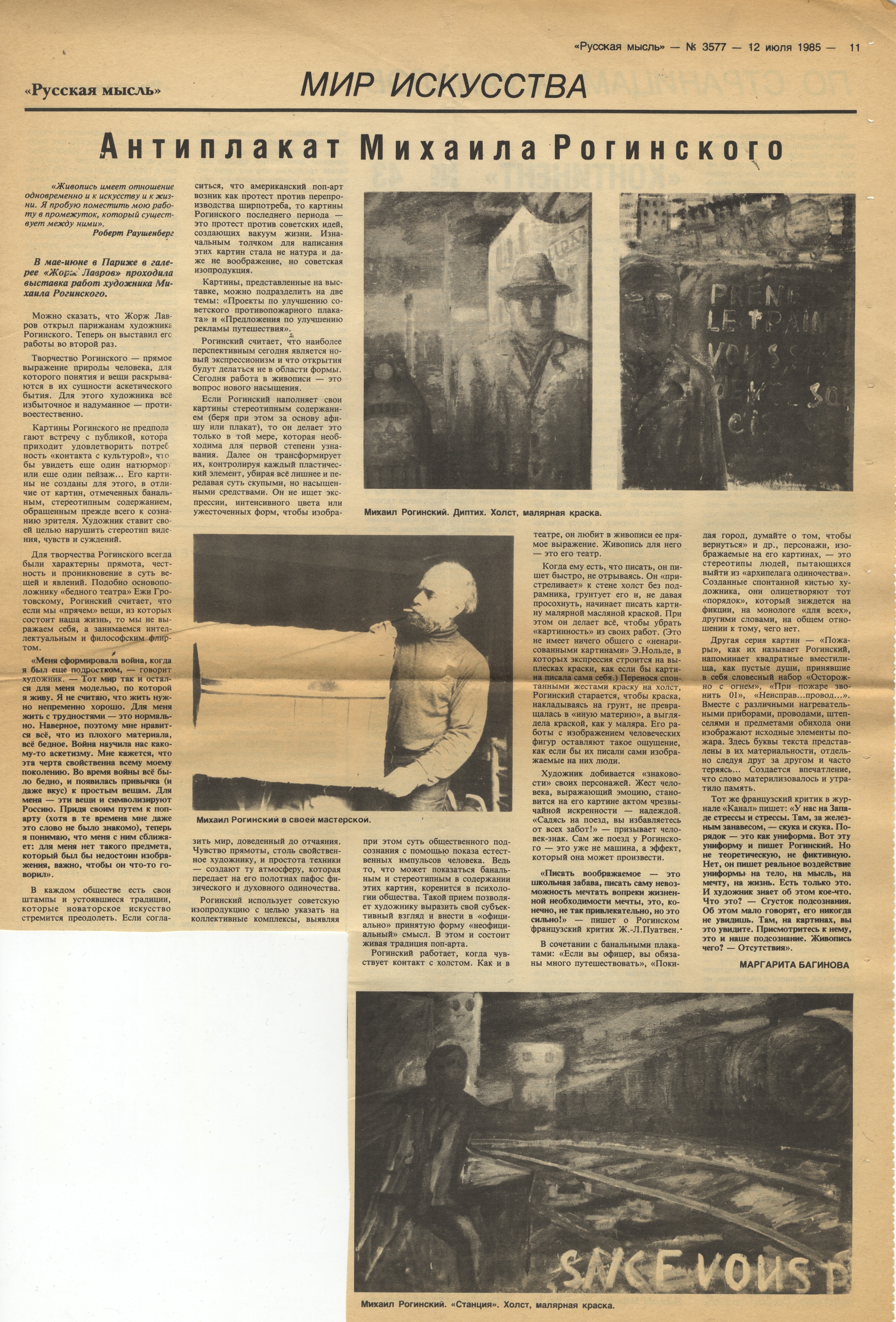 Margharita Baginova, Antiplakat Mikhaila Roginskogo (Mikhail Roginsky’s Anti-Poster) , Russkaya Mysl, 12.07.1985, 3577, Paris