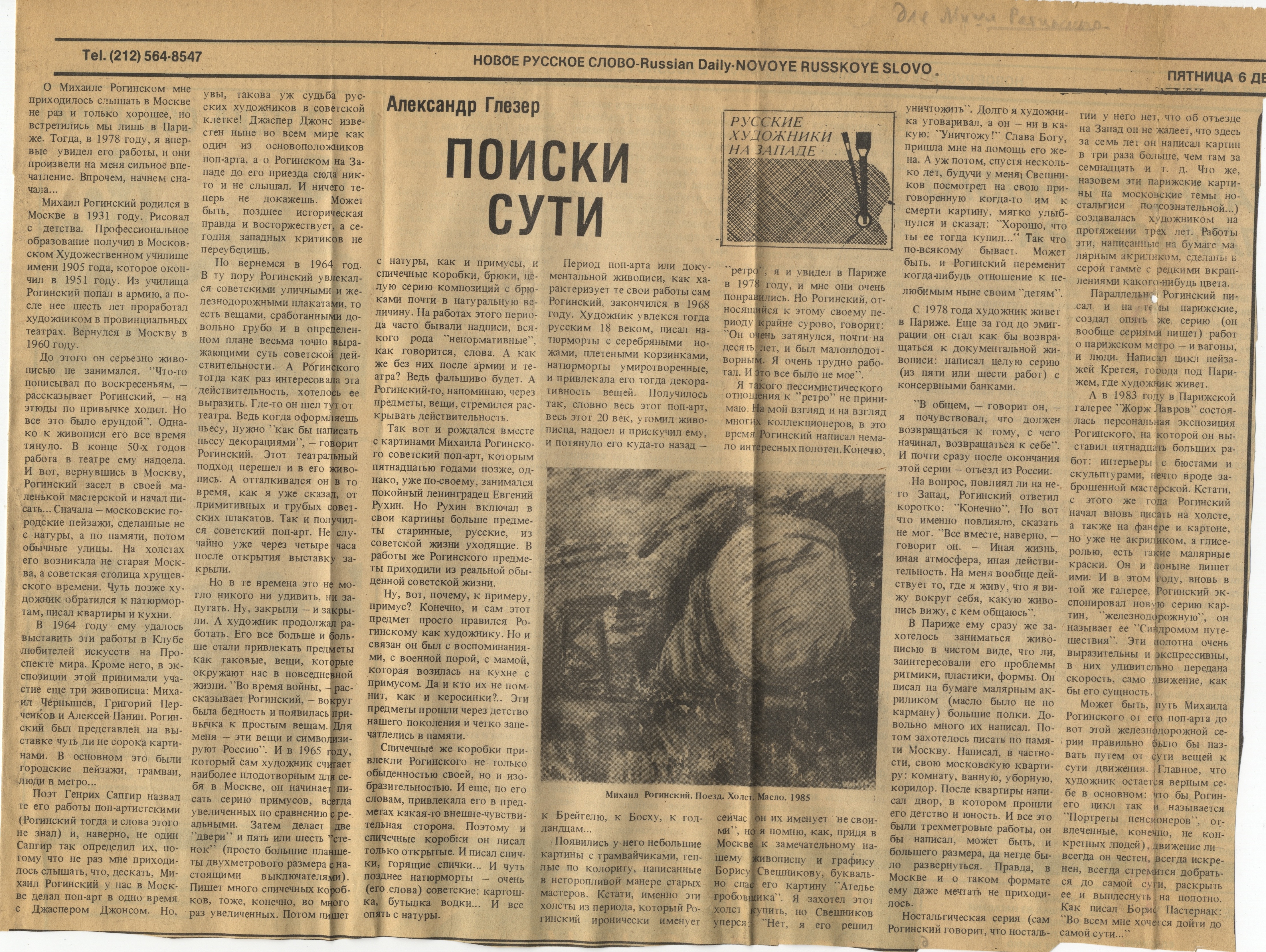 Aleksandr Glezer, "Search for essence", New Russian Word, 06.12.1985, Нью-Йорк