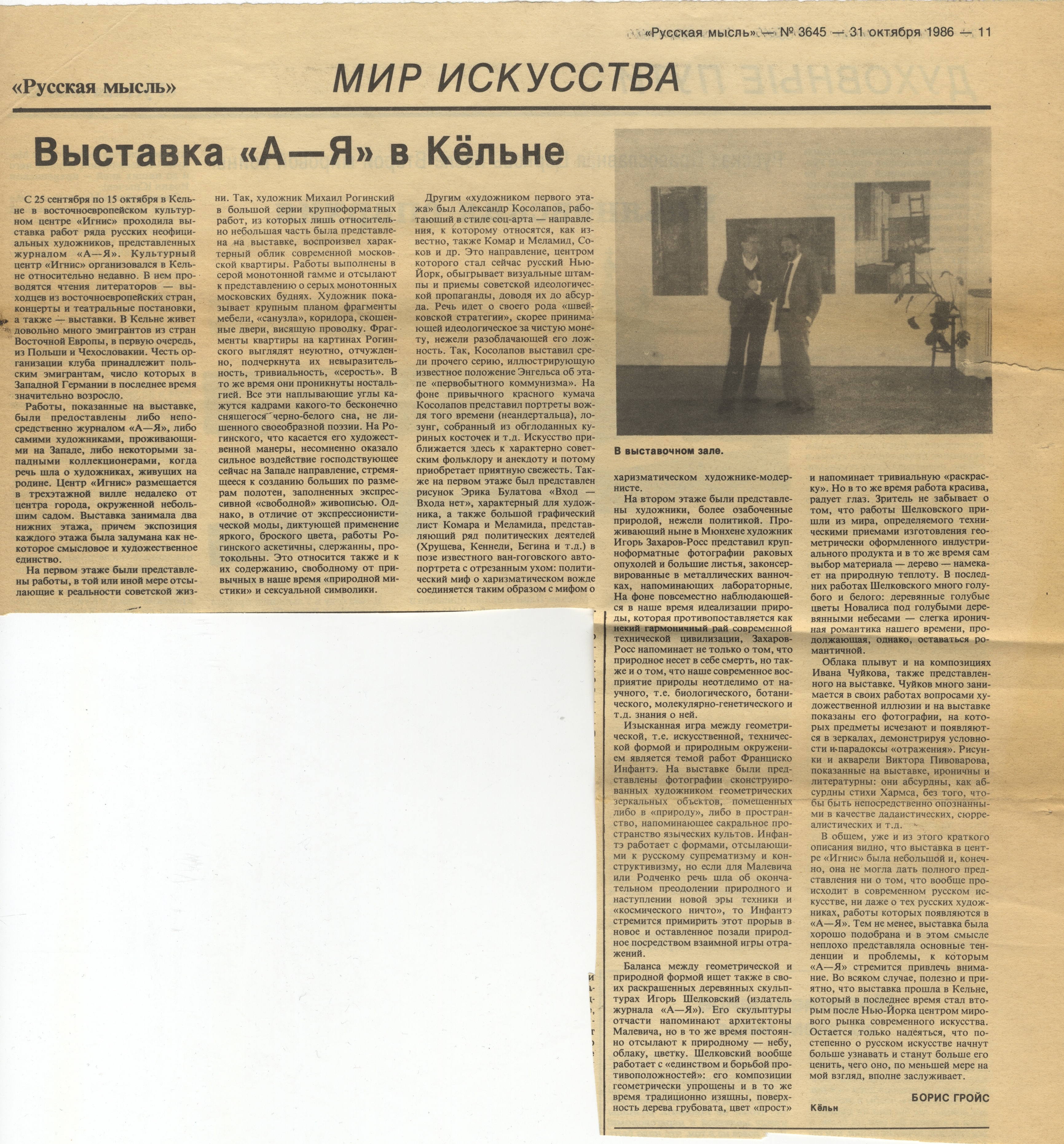 Boris Grois, Vystavka ‘A-Ya’ v Kel’ne. (‘A-Ya’ Exhibition in Cologne), Russkaya Mysl, 31.10.1986, 3645, Paris