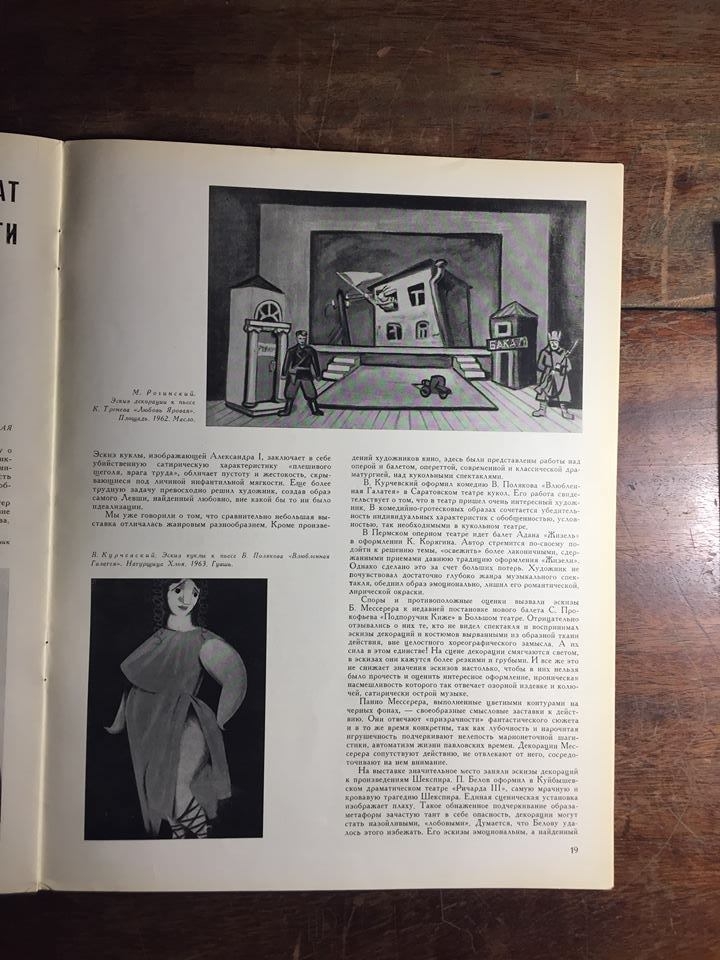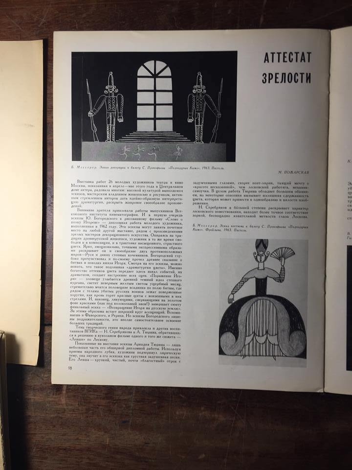 Militsa Pozharskaya, Attestat zrelosti. O vystavke pabot 26 molodykh khudozhnikov teatra i kino Moskvy (Certificate of Maturity.On the Exhibition of Works by 26 Young Moscow Theatre and Cinema Artists) , Tvorchestvo, 1963, №9, Moscow