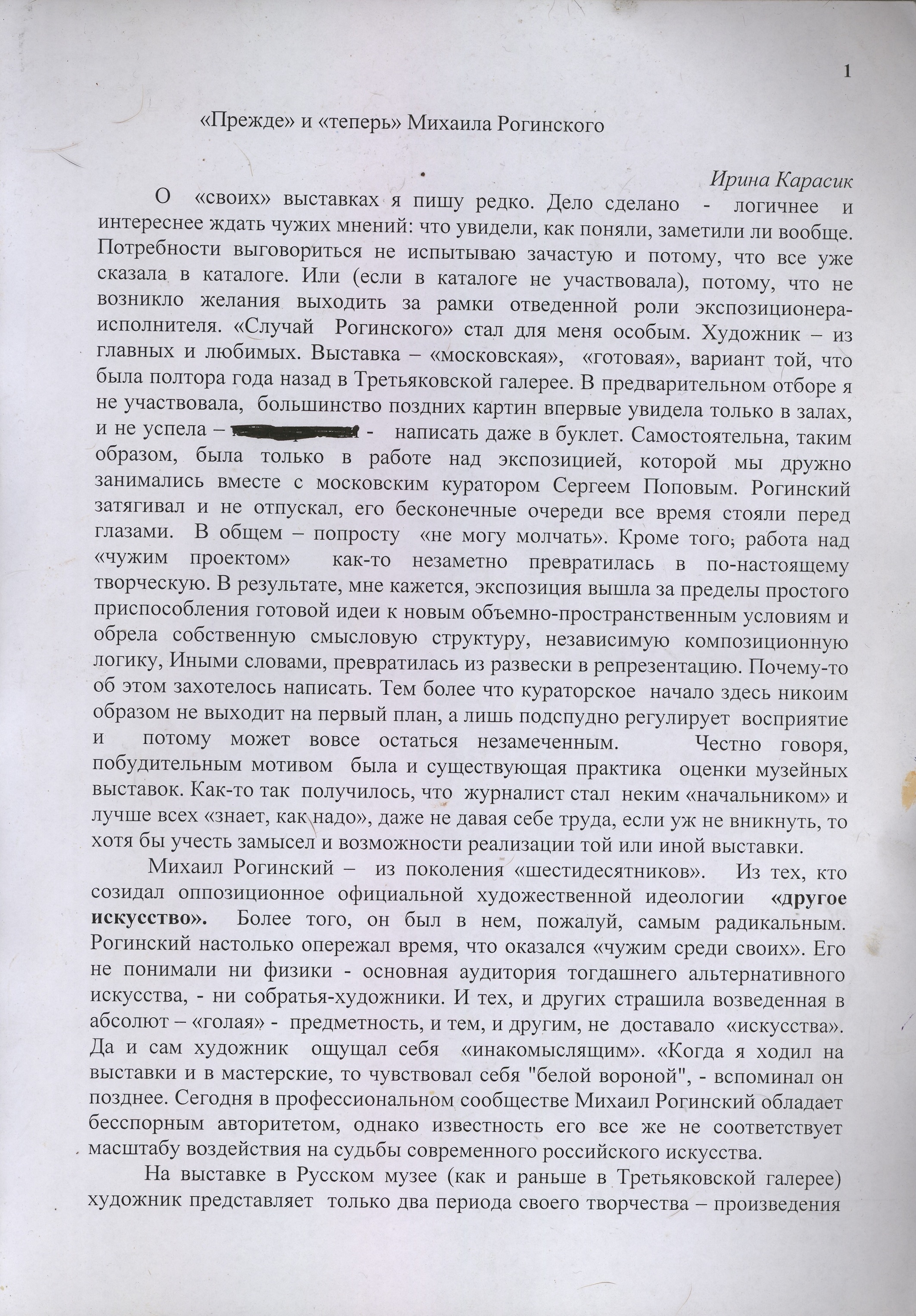 Irina Karasik, "Prezhde i teper" Mikhaila Roginskogo ("Then and Now" of Mikhail Roginsky) , NoMi, 2004, 3, Санкт-Петербург