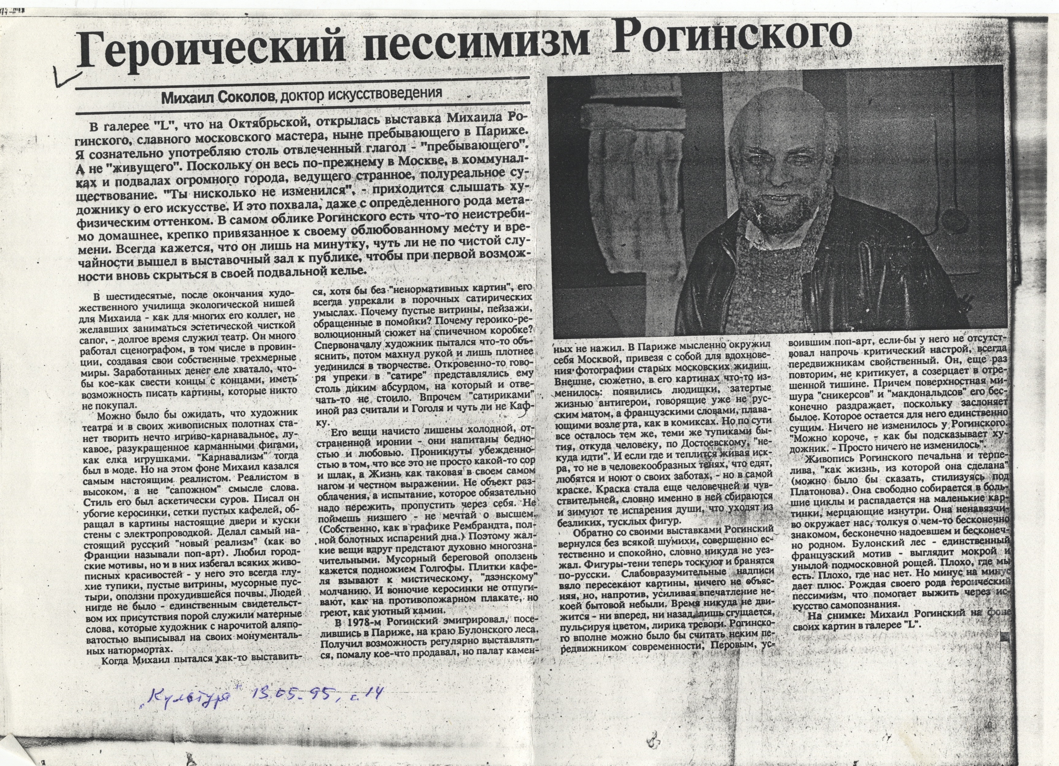 Mikhail Sokolov, Geroicheskii pessimizm Mikhaila Roginskogo (The Heroic Pessimism of Mikhail Roginsky) , Kultura, 13.05.1995, Москва