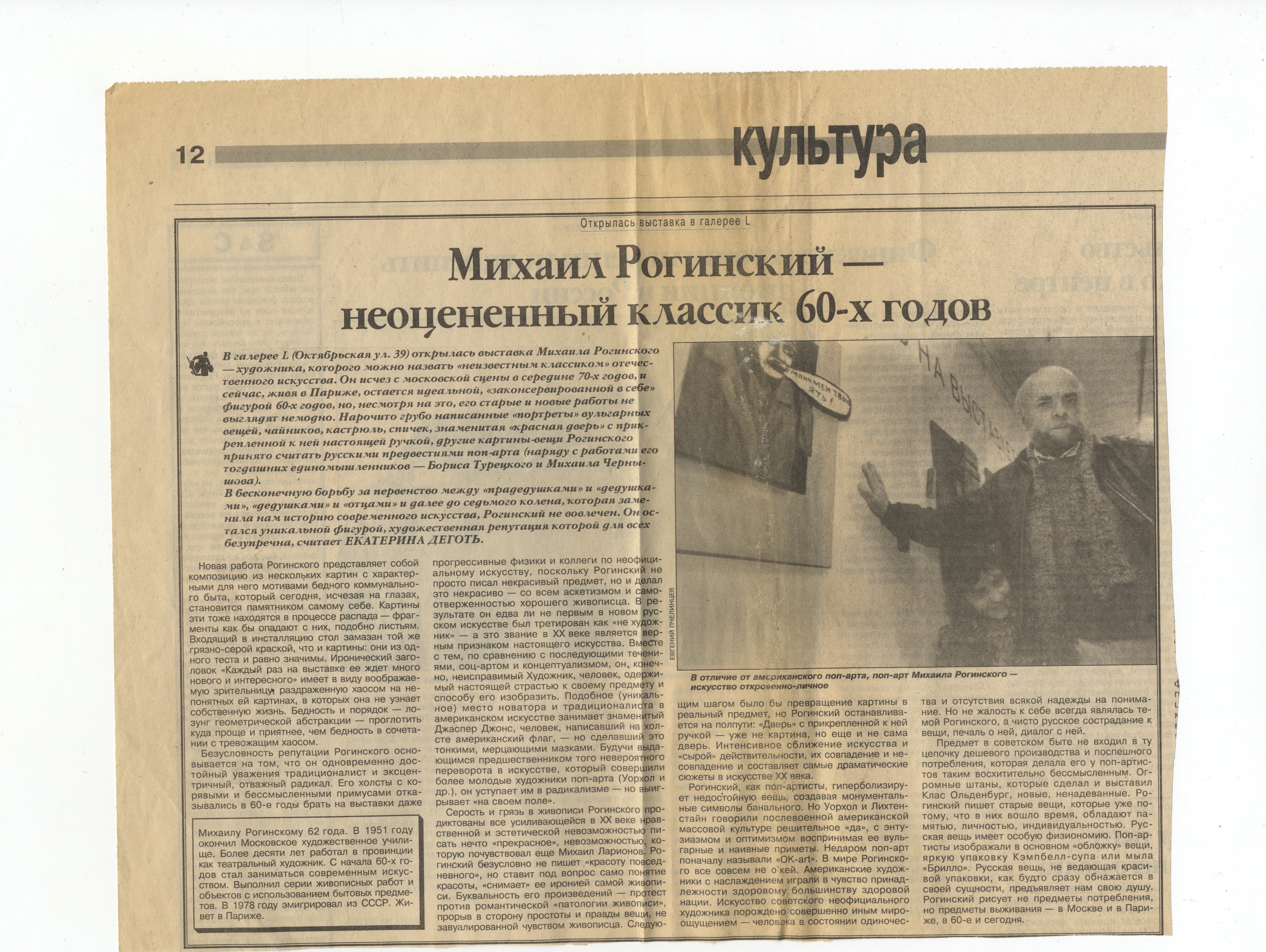 Ekaterina Degot, Mikhail Roginskii — neotsenyonnyi klassik 60-kh godov. (Mikhail Roginsky — Unrecognised Classic of the 60s) , Kommersant-Daily, 19.01.1994, 7, Москва