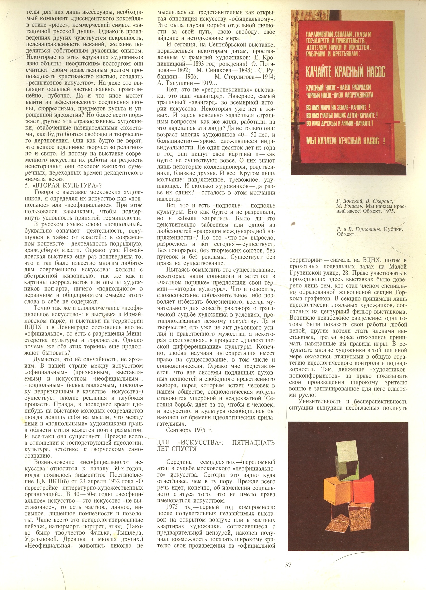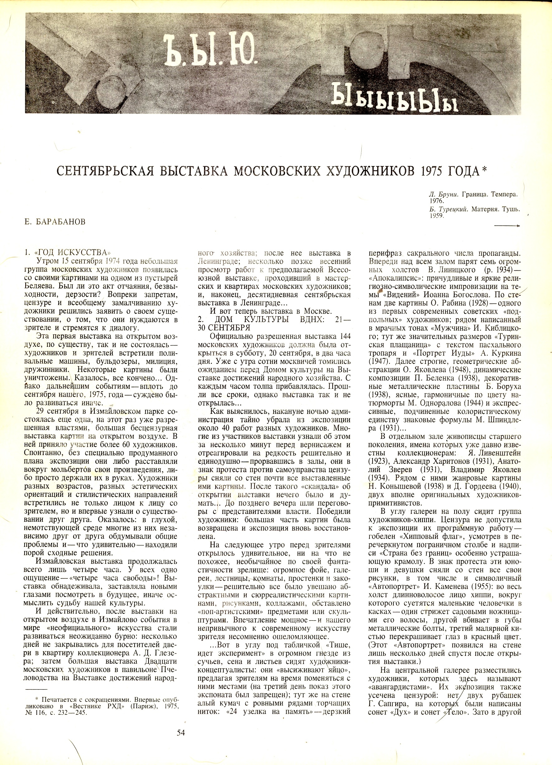 Evgheny Barabanov, Sentyabr’skaya vystavka moskovskikh khudozhnikov 1975 g (The September Exhibition by Moscow Artists in 1975) , Iskusstvo, 01.01.1990, 1, Москва