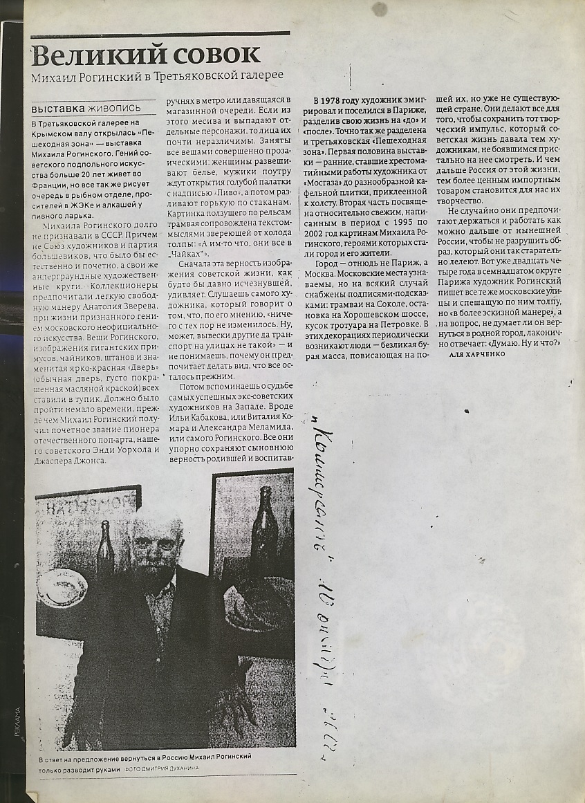 Не случайно они предпочитают держаться и работать как можно дальше от нынешней России, чтобы не разрушить образ, который они так старательно лелеют. Вот уже двадцать четыре года в семнадцатом округе Парижа художник Рогинский пишет все те же московские улицы и спешащую по ним толпу, но "в более эскизной манере", а на вопрос, не думает ли он вернуться в родной город, лаконично отвечает: "Думаю. Ну и что?"