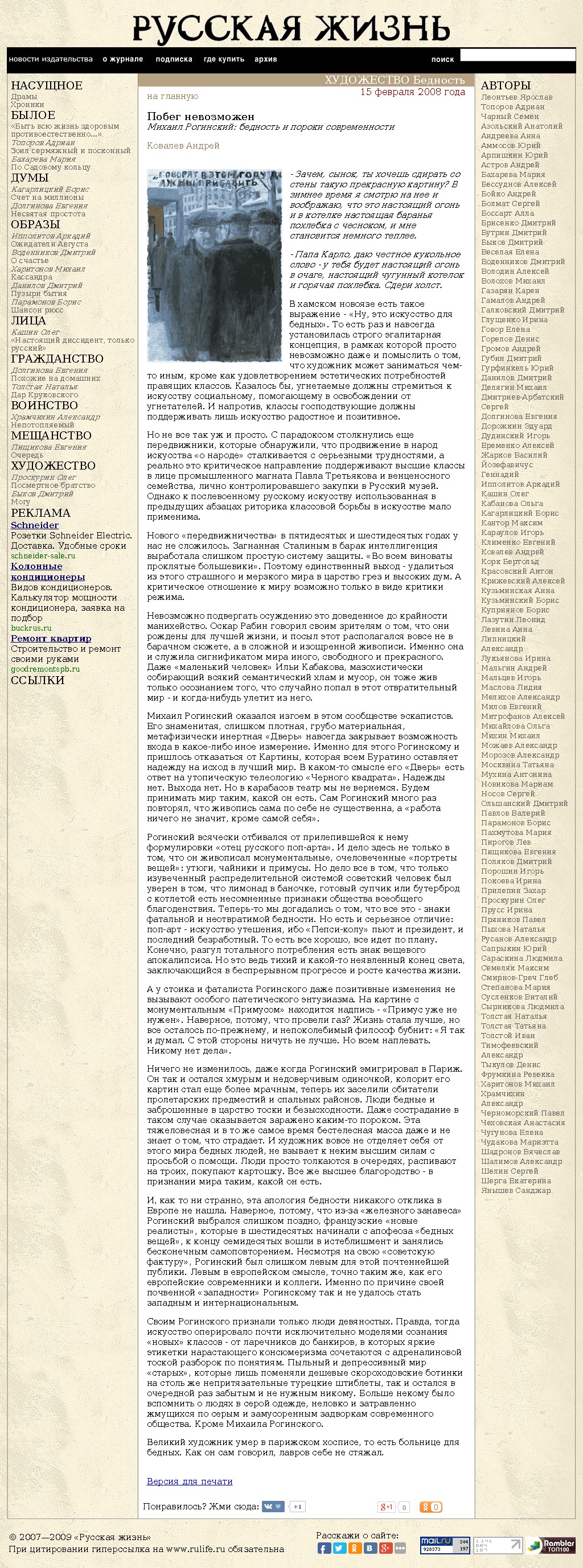 В хамском новоязе есть такое выражение - «Ну, это искусство для бедных». То есть раз и навсегда установилась строго эгалитарная концепция, в рамках которой просто невозможно даже и помыслить о том, что художник может заниматься чем-то иным, кроме как удовлетворением эстетических потребностей правящих классов. Казалось бы, угнетаемые должны стремиться к искусству социальному, помогающему в освобождении от угнетателей. И напротив, классы господствующие должны поддерживать лишь искусство радостное и позитивное. Но не все так уж и просто. С парадоксом столкнулись еще передвижники, которые обнаружили, что продвижение в народ искусства «о народе» сталкивается с серьезными трудностями, а реально это критическое направление поддерживают высшие классы в лице промышленного магната Павла Третьякова и венценосного семейства, лично контролировавшего закупки в Русский музей. Однако к послевоенному русскому искусству использованная в предыдущих абзацах риторика классовой борьбы в искусстве мало применима. Нового «передвижничества» в пятидесятых и шестидесятых годах у нас не сложилось. Загнанная Сталиным в барак интеллигенция выработала слишком простую систему защиты. «Во всем виноваты проклятые большевики». Поэтому единственный выход - удалиться из этого страшного и мерзкого мира в царство грез и высоких дум. А критическое отношение к миру возможно только в виде критики режима. Невозможно подвергать осуждению это доведенное до крайности манихейство. Оскар Рабин говорил своим зрителям о том, что они рождены для лучшей жизни, и посыл этот располагался вовсе не в барачном сюжете, а в сложной и изощренной живописи. Именно она и служила сигнификатом мира иного, свободного и прекрасного. Даже «маленький человек» Ильи Кабакова, мазохистически собирающий всякий семантический хлам и мусор, он тоже жив только осознанием того, что случайно попал в этот отвратительный мир - и когда-нибудь улетит из него. Михаил Рогинский оказался изгоем в этом сообществе эскапистов. Eго знаменитая, слишком плотная, грубо материальная, метафизически инертная «Дверь» навсегда закрывает возможность входа в какое-либо иное измерение. Именно для этого Рогинскому и пришлось отказаться от Картины, которая всем Буратино оставляет надежду на исход в лучший мир. В каком-то смысле его «Дверь» есть ответ на утопическую телеологию «Черного квадрата». Надежды нет. Выхода нет. Но в карабасов театр мы не вернемся. Будем принимать мир таким, какой он есть. Сам Рогинский много раз повторял, что живопись сама по себе не существенна, а «работа ничего не значит, кроме самой себя». Рогинский всячески отбивался от прилепившейся к нему формулировки «отец русского поп-арта». И дело здесь не только в том, что он живописал монументальные, очеловеченные «портреты вещей»: утюги, чайники и примусы. Но дело все в том, что только изувеченный распределительной системой советский человек был уверен в том, что лимонад в баночке, готовый супчик или бутерброд с котлетой есть несомненные признаки общества всеобщего благоденствия. Теперь-то мы догадались о том, что все это - знаки фатальной и неотвратимой бедности. Но есть и серьезное отличие: поп-арт - искусство утешения, ибо «Пепси-колу» пьют и президент, и последний безработный. То есть все хорошо, все идет по плану. Конечно, разгул тотальн
