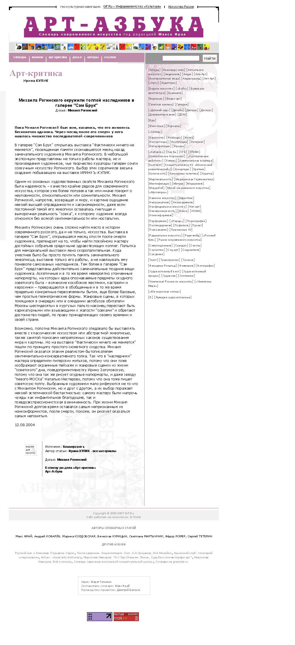 Пока Михаил Рогинский был жив, казалось, что его живопись бесконечно одинока. Через месяц после его смерти у него нашлось множество последователей-современников В галерее "Сэм Брук" открылась выставка "Фактически ничего не меняется", посвященная памяти скончавшегося месяц назад замечательного художника Михаила Рогинского. В небольшой экспозиции представлены не только работы мастера, но и произведения художников, чье творчество кураторы галереи сочли созвучным искусству Рогинского. Выбор этих соратников весьма озадачил побывавшую на выставке ИРИНУ Ъ-КУЛИК. Одним из основных художественных свойств Михаила Рогинского была надежность – качество крайне редкое для современного искусства, которое уже более полувека так или иначе говорит о неуловимости, относительности или сомнительности. Михаил Рогинский, напротив, возвращал и миру, и картине ощущение некоей высшей оправданности и закономерности, даже если постоянной темой его живописи оставалась гнетущая и выморочная реальность "совка", к которому художник всегда относился без всякой сентиментальности или ностальгии. Михаилу Рогинскому очень сложно найти место в истории современного русского, да и не только, искусства. Выставка в галерее "Сэм Брук", открывшаяся месяц спустя после смерти художника, претендует на то, чтобы найти покойному мастеру достойных собратьев среди ныне здравствующих коллег. Попытка для мемориальной выставки явно скоропалительная. Куда уместнее было бы просто почтить память замечательного живописца, выставив только его работы, а не навязывать ему поневоле самозваных наследников. Тем более в галерее "Сэм Брук" представлены действительно замечательные поздние вещи художника. Аскетичные и в то же время невероятно утонченные натюрморты, на которых едва опознаваемые предметы скудного советского быта – всяческие кособокие жестянки, кастрюли и керосинки – превращаются в обобщенные и в то же время предельно конкретные первоэлементы бытия, еще более базовые, чем простые геометрические формы. Жанровые сцены, в которых томящиеся в очередях или в ожидании автобусов обитатели Москвы шестидесятых в кургузых пальто наконец перестают быть карикатурными или взывающими к жалости "совками" и обретают достоинство людей, по праву принадлежащих своему времени и своей стране. Возможно, полотна Михаила Рогинского следовало бы выставлять вместе с классическим искусством или абстрактной живописью, также занятой поисками непреложных законов существования мира и картины. Но на выставке "Фактически ничего не меняется" пошли по принципу простого сюжетного сходства. Михаил Рогинский оказался этаким реалистом-бытописателем сентиментально-консервативного толка. Так что в "наследники" мастера определили питерских митьков, потому что они тоже изображают окраинные пейзажи и жанровые сценки из жизни "советского" дна, псевдопримитивистку Ирину Затуловскую, потому что она так же рисует скудные натюрморты, и даже звезду "левого МОСХа" Наталью Нестерову, потому что она тоже пишет советскую толпу. Выбранные художники мало рифмуются не то что с Михаилом Рогинским, но и друг с другом, а их выбор поражает некоей эстетической бестактностью: самому мастеру были напрочь чужды как инфантильное благодушие, так и псевдоэкспрессионистская взвинченность. При жизни Михаил Роги