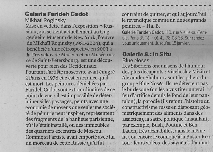 Harry Bellet, Galerie Farideh Cadot: Mikhaїl Roginsky , Le Monde, 17.12.2005, Париж