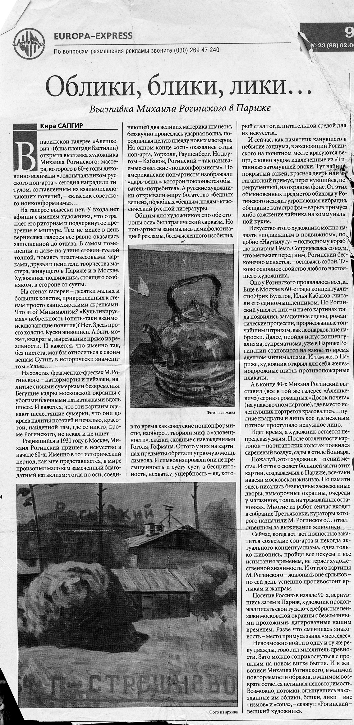 Кира Сапгир , Облики, блики, лики... Выставка Михаила Рогинского в Париже, Europa-Express, 05.2003, 23 (89), Париж