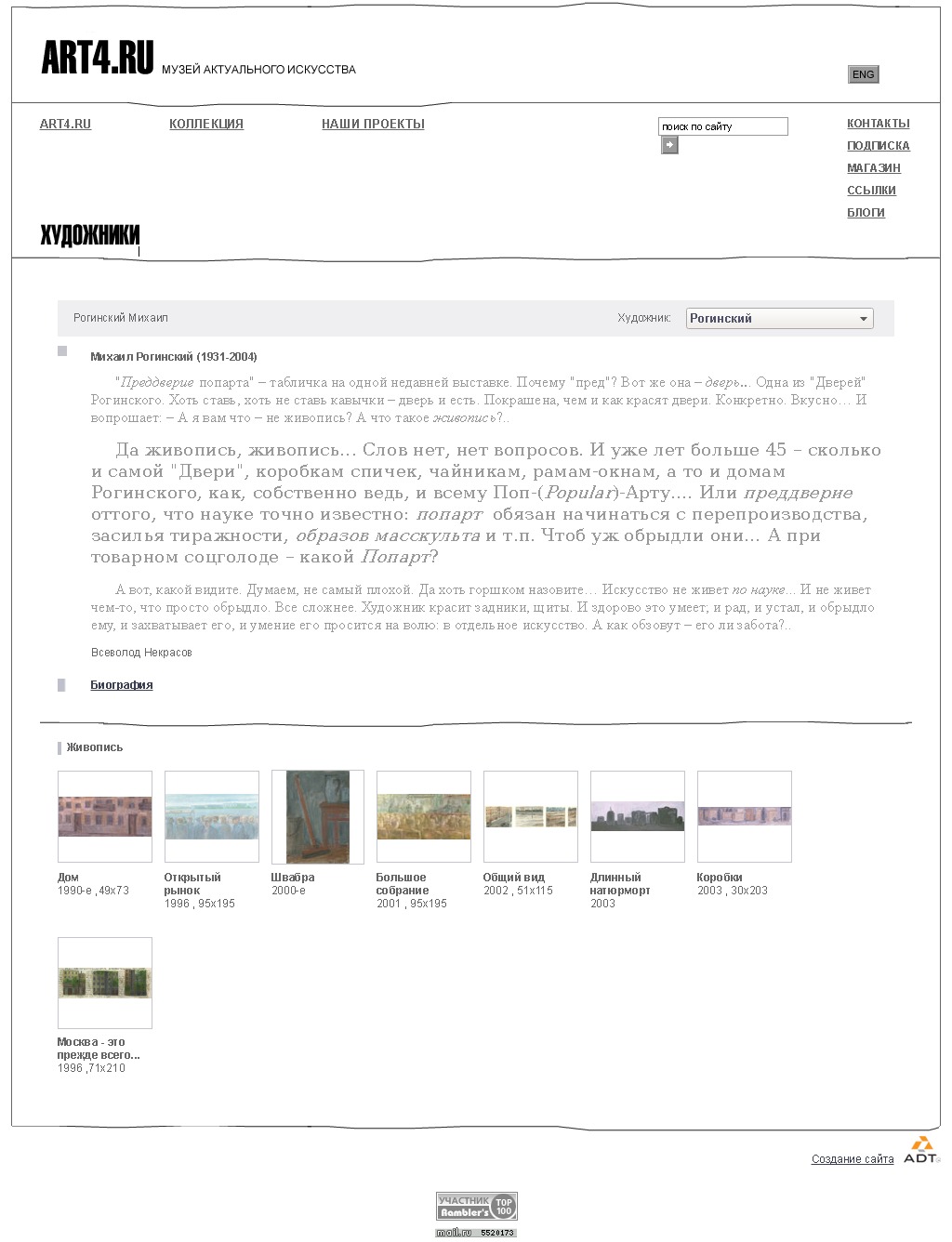 "Преддверие попарта" – табличка на одной недавней выставке. Почему "пред"? Вот же она – дверь... Одна из "Дверей" Рогинского. Хоть ставь, хоть не ставь кавычки – дверь и есть. Покрашена, чем и как красят двери. Конкретно. Вкусно… И вопрошает: – А я вам что – не живопись? А что такое живопись?..