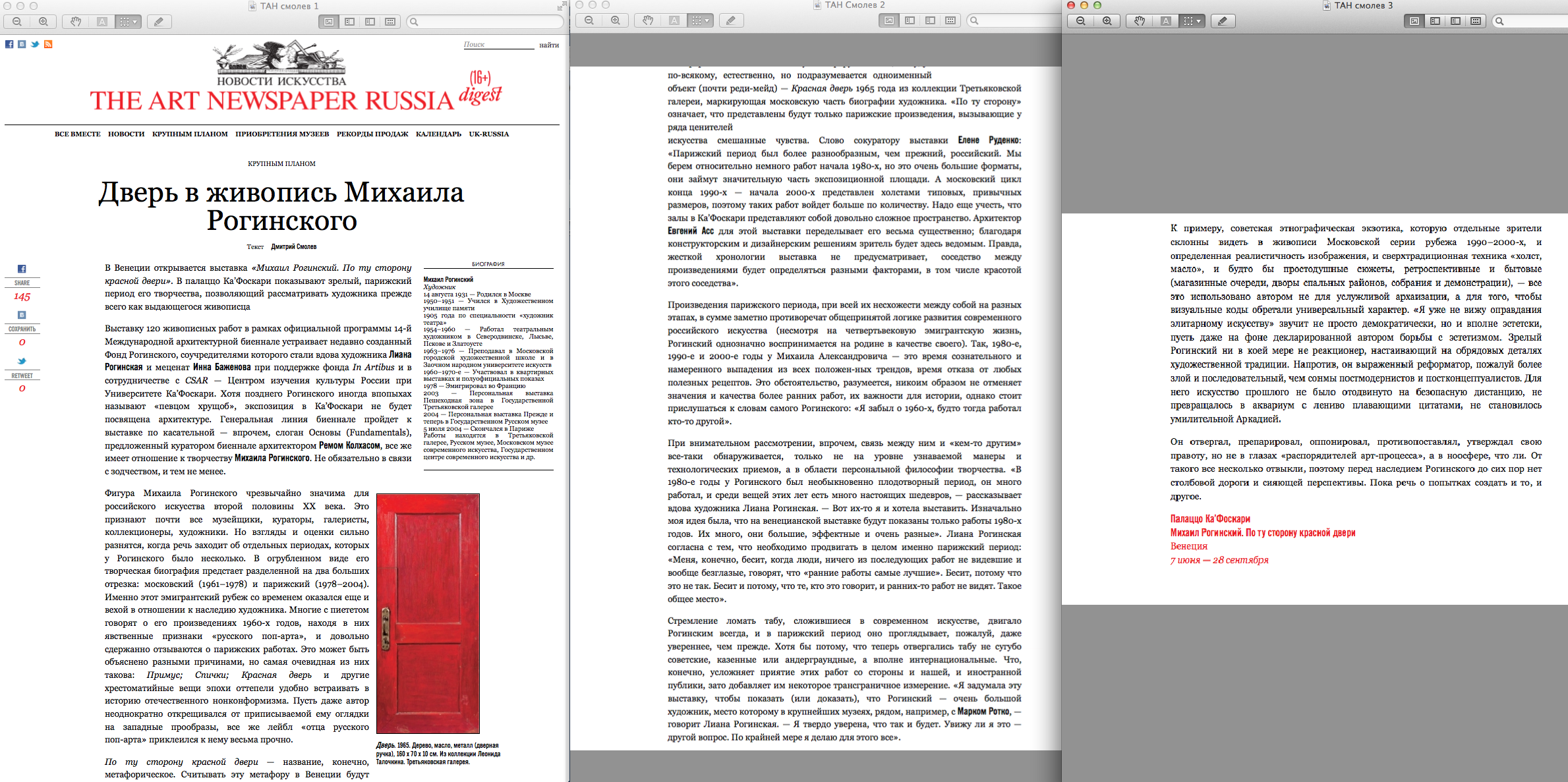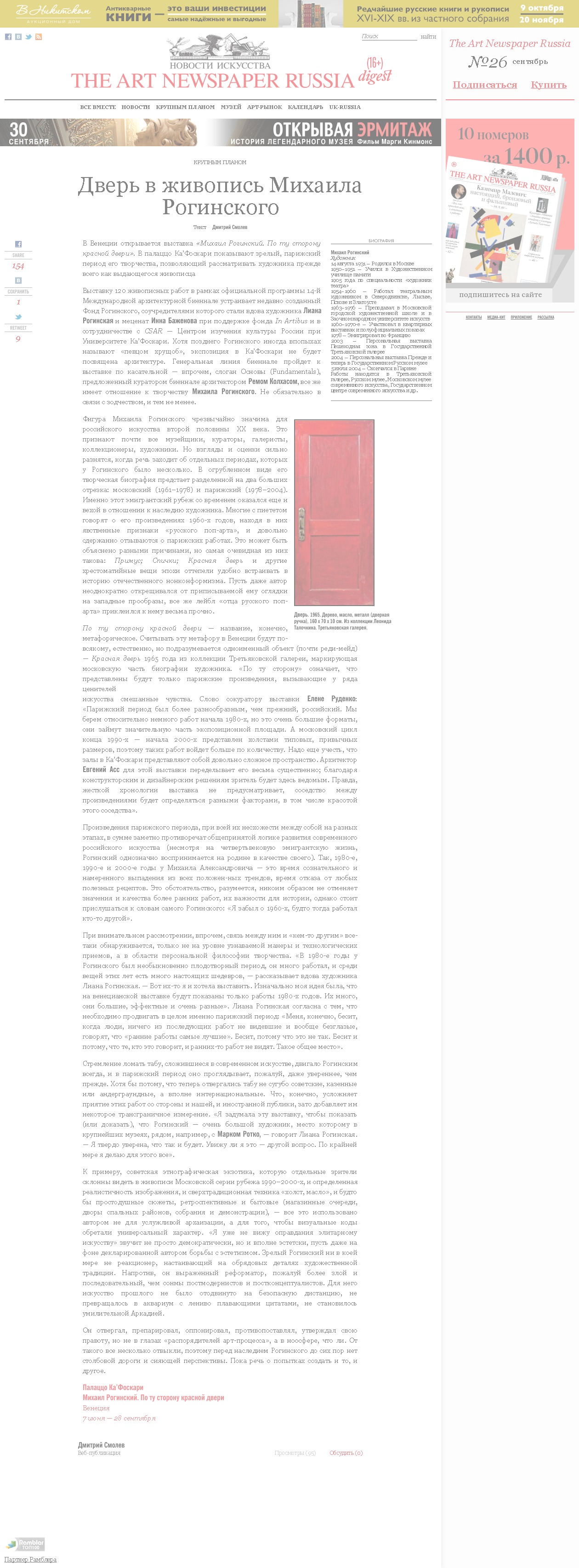 искусства смешанные чувства. Слово сокуратору выставки Елене Руденко: «Парижский период был более разнообразным, чем прежний, российский. Мы берем относительно немного работ начала 1980-х, но это очень большие форматы, они займут значительную часть экспозиционной площади. А московский цикл конца 1990-х — начала 2000-х представлен холстами типовых, привычных размеров, поэтому таких работ войдет больше по количеству. Надо еще учесть, что залы в Ка’Фоскари представляют собой довольно сложное пространство. Архитектор Евгений Асс для этой выставки переделывает его весьма существенно; благодаря конструкторским и дизайнерским решениям зритель будет здесь ведомым. Правда, жесткой хронологии выставка не предусматривает, соседство между произведениями будет определяться разными факторами, в том числе красотой этого соседства».
