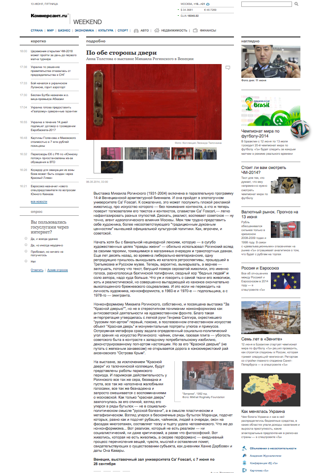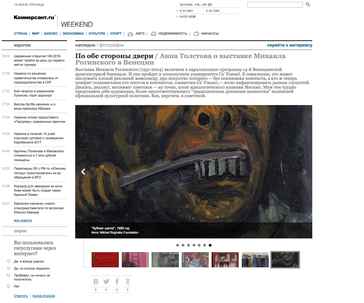 Выставка Михаила Рогинского (1931-2004) включена в параллельную программу 14-й Венецианской архитектурной биеннале. И она пройдет в злополучном университете Ca' Foscari. К сожалению, это может послужить плохой рекламой живописцу, про искусство которого — без понимания контекста, а кто ж теперь поверит толкователям его текстов и контекстов, славистам Ca' Foscari,— легко нафантазировать разных глупостей. Дескать, реалист, воспевает советское — ну точно, агент идеологического влияния Москвы. Меж тем трудно представить себе художника, более несоответствующего "традиционным духовным ценностям" нынешней официальной культурной политики. Как, впрочем, и советской.