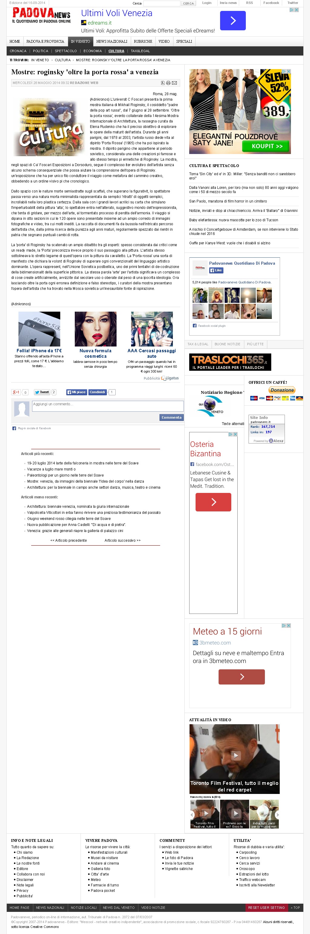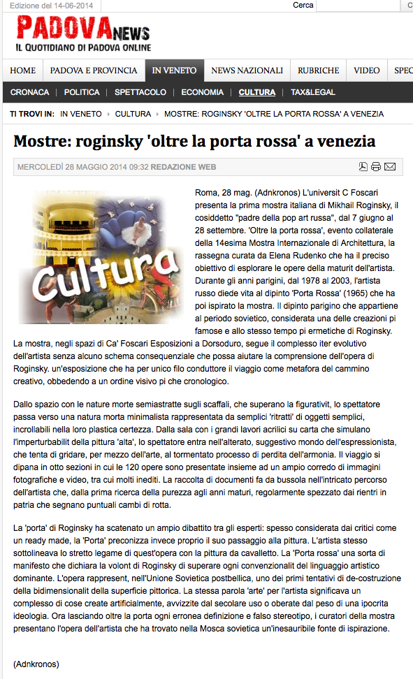 L'universit C Foscari presenta la prima mostra italiana di Mikhail Roginsky, il cosiddetto "padre della pop art russa", dal 7 giugno al 28 settembre. 'Oltre la porta rossa', evento collaterale della 14esima Mostra Internazionale di Architettura, la rassegna curata da Elena Rudenko che ha il preciso obiettivo di esplorare le opere della maturit dell'artista. Durante gli anni parigini, dal 1978 al 2003, l'artista russo diede vita al dipinto 'Porta Rossa' (1965) che ha poi ispirato la mostra. Il dipinto parigino che appartiene al periodo sovietico, considerata una delle creazioni pi famose e allo stesso tempo pi ermetiche di Roginsky. La mostra, negli spazi di Ca' Foscari Esposizioni a Dorsoduro, segue il complesso iter evolutivo dell'artista senza alcuno schema consequenziale che possa aiutare la comprensione dell'opera di Roginsky. un'esposizione che ha per unico filo conduttore il viaggio come metafora del cammino creativo, obbedendo a un ordine visivo pi che cronologico. Dallo spazio con le nature morte semiastratte sugli scaffali, che superano la figurativit, lo spettatore passa verso una natura morta minimalista rappresentata da semplici 'ritratti' di oggetti semplici, incrollabili nella loro plastica certezza. Dalla sala con i grandi lavori acrilici su carta che simulano l'imperturbabilit della pittura 'alta', lo spettatore entra nell'alterato, suggestivo mondo dell'espressionista, che tenta di gridare, per mezzo dell'arte, al tormentato processo di perdita dell'armonia. Il viaggio si dipana in otto sezioni in cui le 120 opere sono presentate insieme ad un ampio corredo di immagini fotografiche e video, tra cui molti inediti. La raccolta di documenti fa da bussola nell'intricato percorso dell'artista che, dalla prima ricerca della purezza agli anni maturi, regolarmente spezzato dai rientri in patria che segnano puntuali cambi di rotta. La 'porta' di Roginsky ha scatenato un ampio dibattito tra gli esperti: spesso considerata dai critici come un ready made, la 'Porta' preconizza invece proprio il suo passaggio alla pittura. L'artista stesso sottolineava lo stretto legame di quest'opera con la pittura da cavalletto. La 'Porta rossa' una sorta di manifesto che dichiara la volont di Roginsky di superare ogni convenzionalit del linguaggio artistico dominante. L'opera rappresent, nell'Unione Sovietica postbellica, uno dei primi tentativi di de-costruzione della bidimensionalit della superficie pittorica. La stessa parola 'arte' per l'artista significava un complesso di cose create artificialmente, avvizzite dal secolare uso o oberate dal peso di una ipocrita ideologia. Ora lasciando oltre la porta ogni erronea definizione e falso stereotipo, i curatori della mostra presentano l'opera dell'artista che ha trovato nella Mosca sovietica un'inesauribile fonte di ispirazione.