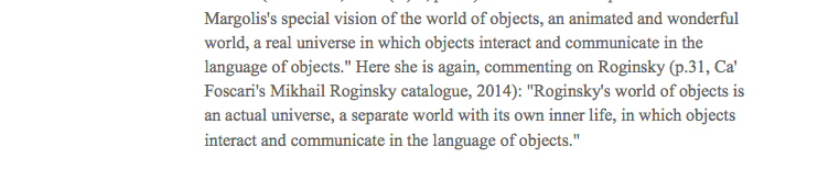 PS: No letter from Venice would be complete without a light-hearted look at behind-the-scenes politics. There is an interesting back story to the Roginsky exhibition, well worth relating. On the opening night the Russian artist Katia Margolis was denied entry to the vernissage, despite having been invited as the personal guest of the artist's widow, Liana Roginsky. Margolis was one of several hundred people - Venetians and expatriates - who had spoken out against Ca' Foscari's decision to award an honorary doctorate to Putin's Minister of Culture, Vladimir Medinsky. Margolis's comments were more closely-reasoned and persuasive than most - and they clearly ruffled the feathers of Silvia Burini, babushka-in-chief at Ca' Foscari's Centre for the Study of Russian Art. Burini, who resigned after the Medinsky award, was furious to hear that Margolis had turned up at the opening - so much so that despite the personal intervention of Liana Roginsky herself, she resolutely refused to let Margolis in. This is ironic, given that Burini is as a great an admirer of Margolis as she is of Roginsky. Here is Burini writing on Margolis in 2007 (eSamizdat, 2007 (V) 3, p.266): "From this concept flows Katia Margolis's special vision of the world of objects, an animated and wonderful world, a real universe in which objects interact and communicate in the language of objects." Here she is again, commenting on Roginsky (p.31, Ca' Foscari's Mikhail Roginsky catalogue, 2014): "Roginsky's world of objects is an actual universe, a separate world with its own inner life, in which objects interact and communicate in the language of objects."