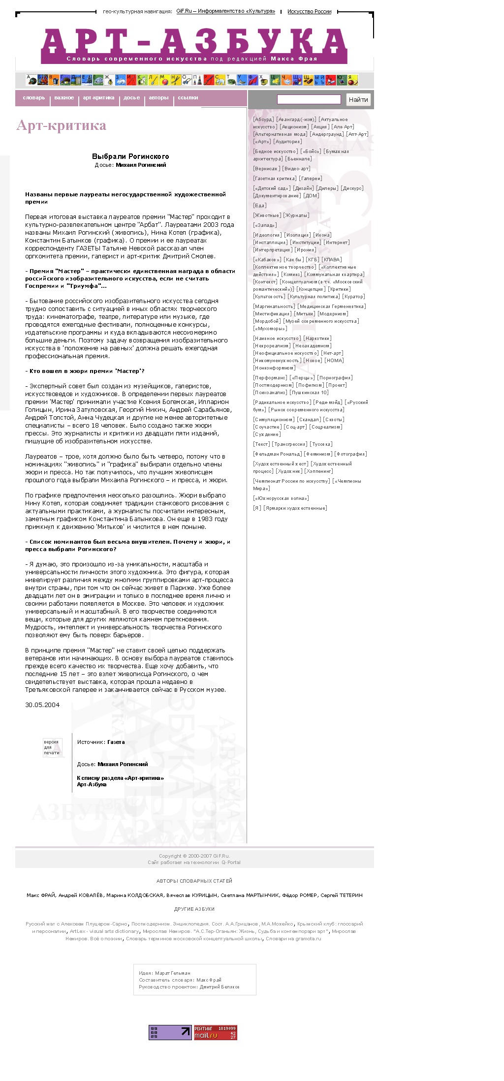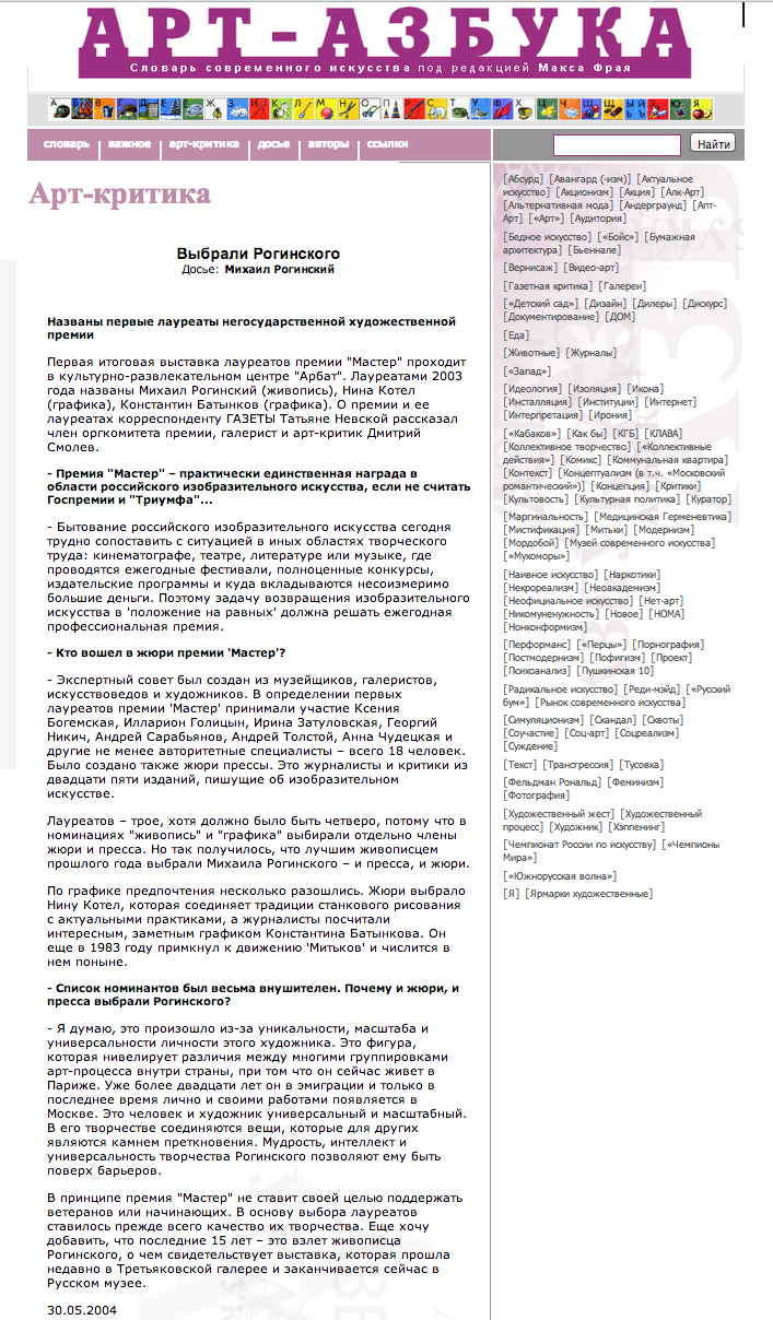 Первая итоговая выставка лауреатов премии "Мастер" проходит в культурно-развлекательном центре "Арбат". Лауреатами 2003 года названы Михаил Рогинский (живопись), Нина Котел (графика), Константин Батынков (графика). О премии и ее лауреатах корреспонденту ГАЗЕТЫ Татьяне Невской рассказал член оргкомитета премии, галерист и арт-критик Дмитрий Смолев.