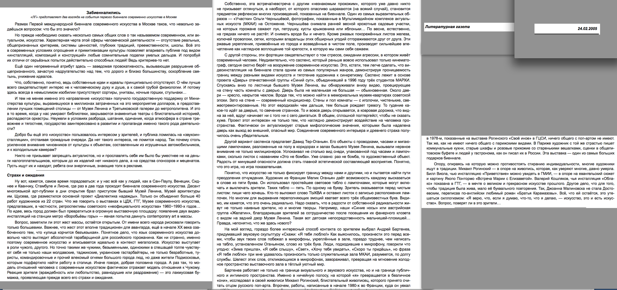 Ну вот, кажется, самое время порадоваться: и у нас всё как у людей, как в Сан-Паулу, Венеции, Сиднее и Кванчжу, Стамбуле и Лионе, где раз в два года проходят биеннале современного искусства. Десант многоязыкой арт-публики в дни открытия брал приступом бывший Музей Ленина, Музей архитектуры им. Щусева, где разместился основной проект «Диалектика надежды». Только он объединил больше 40 работ художников из 22 стран. Что же говорить о выставках в ЦДХ, ГТГ, Музее современного искусства, предлагавших, в частности, ретроспективы советского «неофициального искусства» 1960−1990-х годов По идее, весь город должен был превратиться в огромную выставочную площадку: появление двух видеоинсталляций на станции метро «Воробьёвы горы» — явная попытка двинуть contemporary art в массы.
