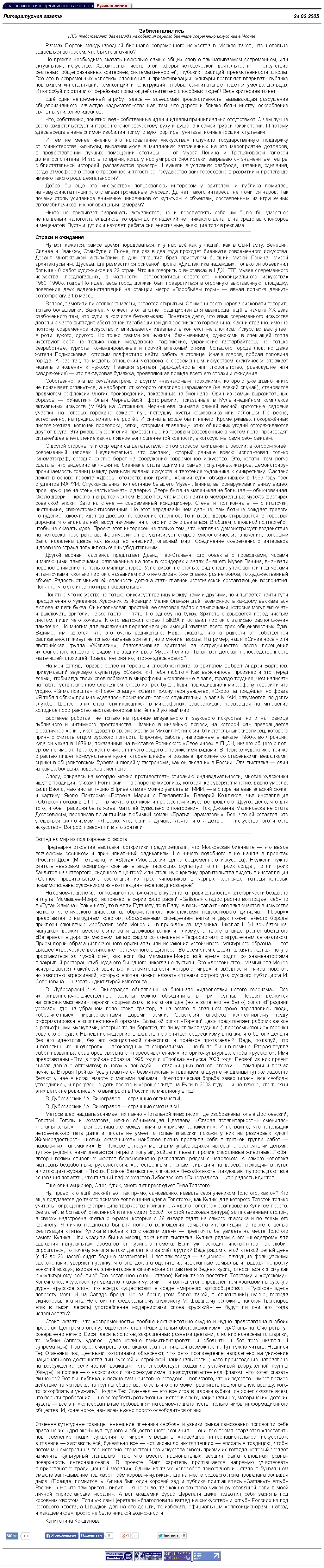 Ну, право, кто ещё рискнёт вот так прямо, самозванно, назвать себя учеником Толстого, как он? Кто ещё додумается до такого зримого воплощения «дела Толстого», как Кулик, для которого Толстой только учитель «опрощения как принципа творчества и жизни». А «дело Толстого» реализовано Куликом просто, без затей: в большой стеклянной клетке сидит босой Толстой (восковая фигура) за письменным столом, а сверху надстроена клетка с курами, которые с 28 января гадят на самого классика и по всему его кабинету. Я лично предпочла бы для полного воплощения замысла инсталляции, а также с целью реализации клятвы Кулика в любви к толстовским идеям — предпочла бы увидеть на месте Толстого самого Кулика. Или усадила бы на месяц, пока идёт выставка, Кулика рядом с его «шедевром» для вдыхания натуральных ароматов от куриного помёта. Если уж господин инсталлятор так любит опрощаться, то почему же опять-таки делает это за счёт других? Ведь рядом с этой клеткой целый день (с 12 до 20 часов) сидят бедные смотрители! И вот так всегда — акционеры, пахнущие французскими одеколонами, уверяют публику, что она должна оценить их изысканные замыслы, и, вдыхая попросту вонючий воздух, взирая на элементарные физические отправления бедных куриц, относиться к этому как к «культурному событию" Всё остальное (очень старое) Кулик также посвятил Толстому и «русскому». Конечно же, «русское» тут увидено глазами чужими — и взгляд этот определён тем «заказом на русскую дурь», «русское зло», что всегда существовал в среде «мирового артсообщества». «Русское» здесь попросту модный на Западе бренд. Но за бренд (тем более такой, тысячелетний!) нужно, господа акционеры, платить. Не стоит ли федеральному службисту М. Швыдкому обложить налогом (долларов этак в тысяч десять) употребление модернистами слова «русский» — будут ли они его тогда использовать?