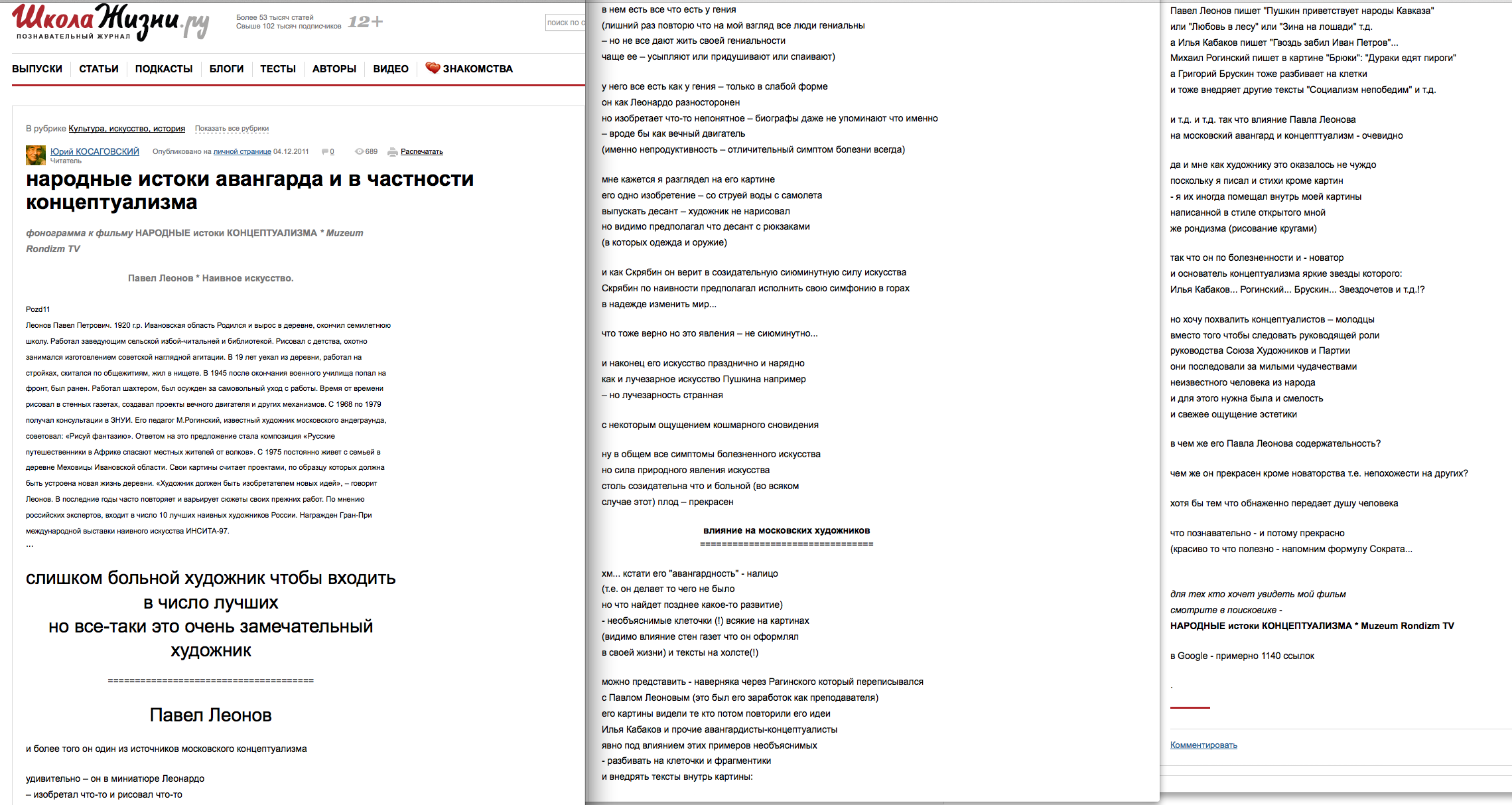 хм... кстати его "авангардность" - налицо (т.е. он делает то чего не было но что найдет позднее какое-то развитие) - необъяснимые клеточки (!) всякие на картинах (видимо влияние стен газет что он оформлял в своей жизни) и тексты на холсте(!) можно представить - наверняка через Рагинского который переписывался с Павлом Леоновым (это был его заработок как преподавателя) его картины видели те кто потом повторили его идеи Илья Кабаков и прочие авангардисты-концептуалисты явно под влиянием этих примеров необъяснимых - разбивать на клеточки и фрагментики и внедрять тексты внутрь картины: Павел Леонов пишет "Пушкин приветствует народы Кавказа" или "Любовь в лесу" или "Зина на лошади" т.д. а Илья Кабаков пишет "Гвоздь забил Иван Петров"... Михаил Рогинский пишет в картине "Брюки": "Дураки едят пироги" а Григорий Брускин тоже разбивает на клетки и тоже внедряет другие тексты "Социализм непобедим" и т.д. и т.д. и т.д. так что влияние Павла Леонова на московский авангард и концепттуализм - очевидно да и мне как художнику это оказалось не чуждо поскольку я писал и стихи кроме картин - я их иногда помещал внутрь моей картины написанной в стиле открытого мной же рондизма (рисование кругами) так что он по болезненности и - новатор и основатель концептуализма яркие звезды которого: Илья Кабаков... Рогинский... Брускин... Звездочетов и т.д.!? но хочу похвалить концептуалистов – молодцы вместо того чтобы следовать руководящей роли руководства Союза Художников и Партии они последовали за милыми чудачествами неизвестного человека из народа и для этого нужна была и смелость и свежее ощущение эстетики в чем же его Павла Леонова содержательность? чем же он прекрасен кроме новаторства т.е. непохожести на других? хотя бы тем что обнаженно передает душу человека что познавательно - и потому прекрасно (красиво то что полезно - напомним формулу Сократа...