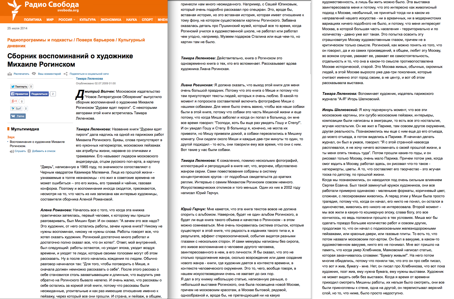 Дмитрий Волчек: Московское издательство “Новое Литературное Обозрение” выпустило сборник воспоминаний о художнике Михаиле Рогинском “Дураки едят пироги”. С некоторыми авторами этой книги встретилась Тамара Ляленкова.