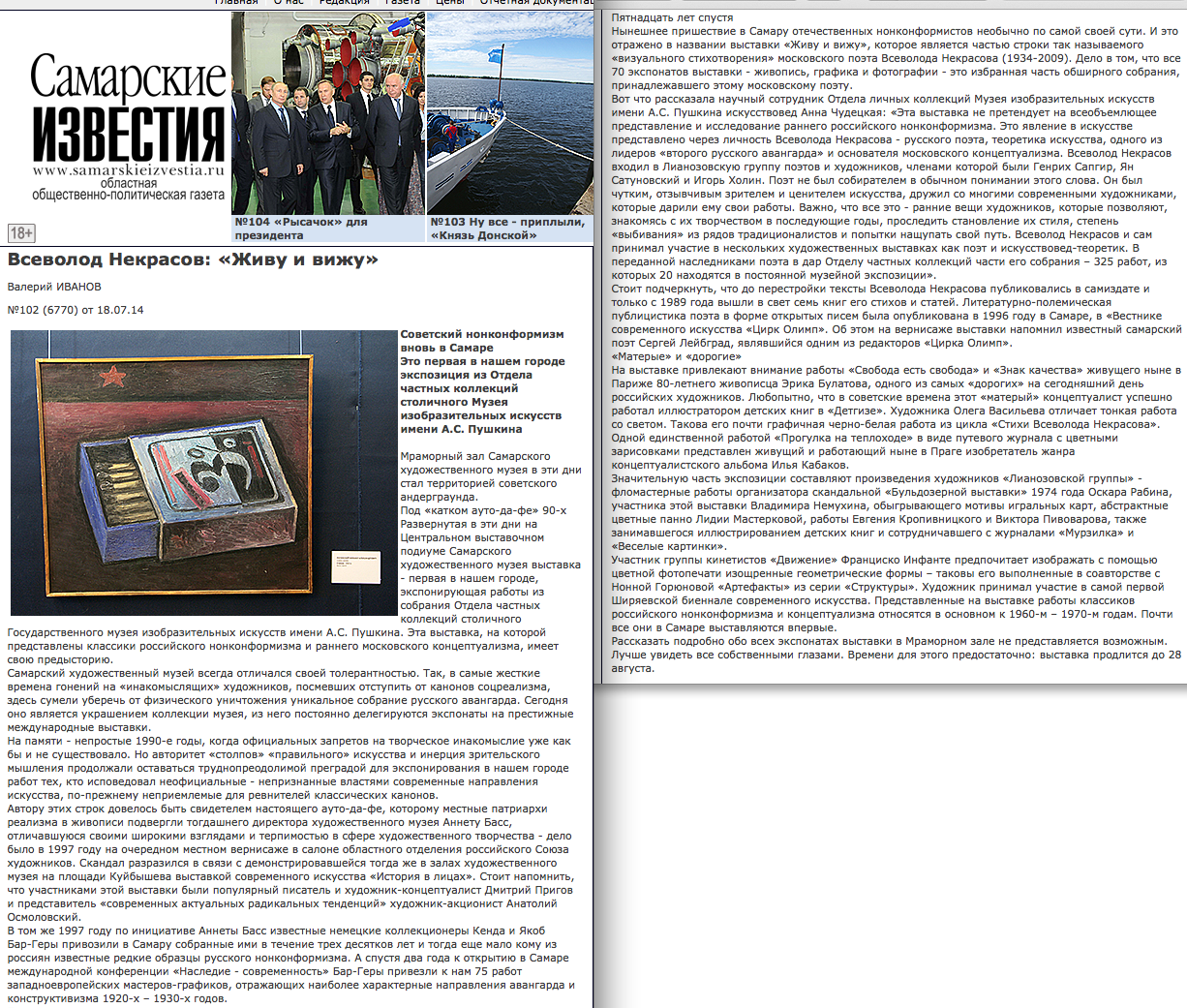 Стоит подчеркнуть, что до перестройки тексты Всеволода Некрасова публиковались в самиздате и только с 1989 года вышли в свет семь книг его стихов и статей. Литературно-полемическая публицистика поэта в форме открытых писем была опубликована в 1996 году в Самаре, в «Вестнике современного искусства «Цирк Олимп». Об этом на вернисаже выставки напомнил известный самарский поэт Сергей Лейбград, являвшийся одним из редакторов «Цирка Олимп».