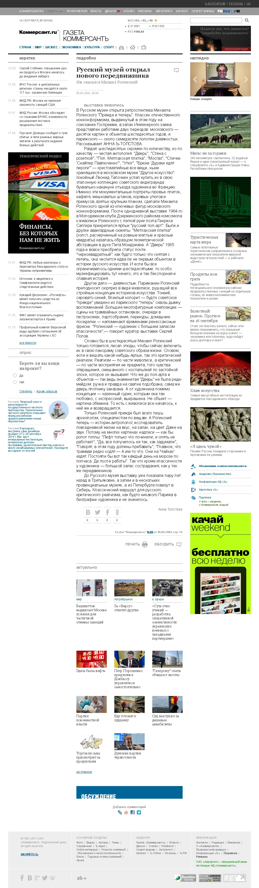 Другое дело — девяностые. Парижанин Рогинский преподносит сюрприз в виде живописи, рушащей все стройные концепции историков искусства. Тонкий, серовато-синий, блеклый колорит — будто советское "прежде" увидено из парижского "теперь" сквозь дымку воспоминаний. Большие многофигурные композиции — сцены на трамвайных остановках, очереди в гастрономах, партсобрания, перекуры, домашние посиделки — напоминают временами ренессансные фрески. "Рогинский — художник с большим запасом классичности",— говорит куратор выставки Сергей Попов.