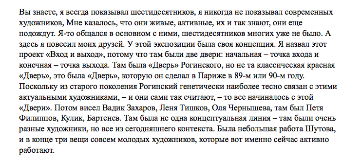 Вы знаете, я всегда показывал шестидесятников, я никогда не показывал современных художников, Мне казалось, что они живые, активные, их и так знают, они еще подождут. Я-то общался в основном с ними, шестидесятников многих уже не было. А здесь я повесил моих друзей. У этой экспозиции была своя концепция. Я назвал этот проект «Вход и выход», потому что там были две двери: начальная – точка входа и конечная – точка выхода. Там была «Дверь» Рогинского, но не та классическая красная «Дверь», это была «Дверь», которую он сделал в Париже в 89-м или 90-м году. Поскольку из старого поколения Рогинский генетически наиболее тесно связан с этими актуальными художниками, – и они сами так считают, – то все начиналось с этой «Двери». Потом висел Вадик Захаров, Леня Тишков, Оля Чернышева, там был Петя Филиппов, Кулик, Бартенев. Там была не одна концептуальная линия – там были очень разные художники, но все из сегодняшнего контекста. Была небольшая работа Шутова, и в конце три вещи совсем молодых художников, которые вот именно сейчас активно работают.