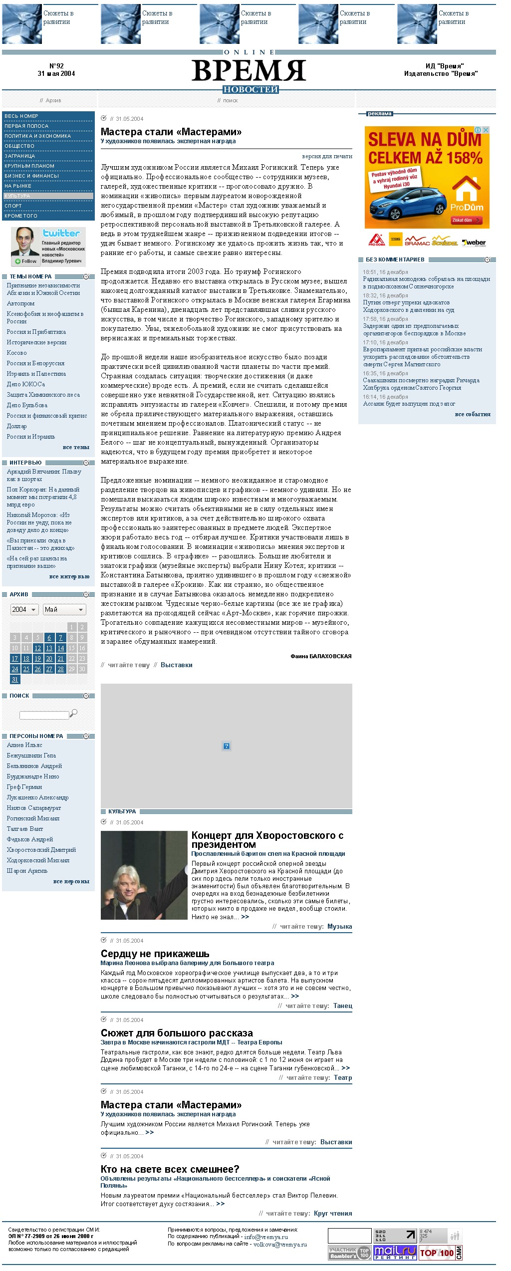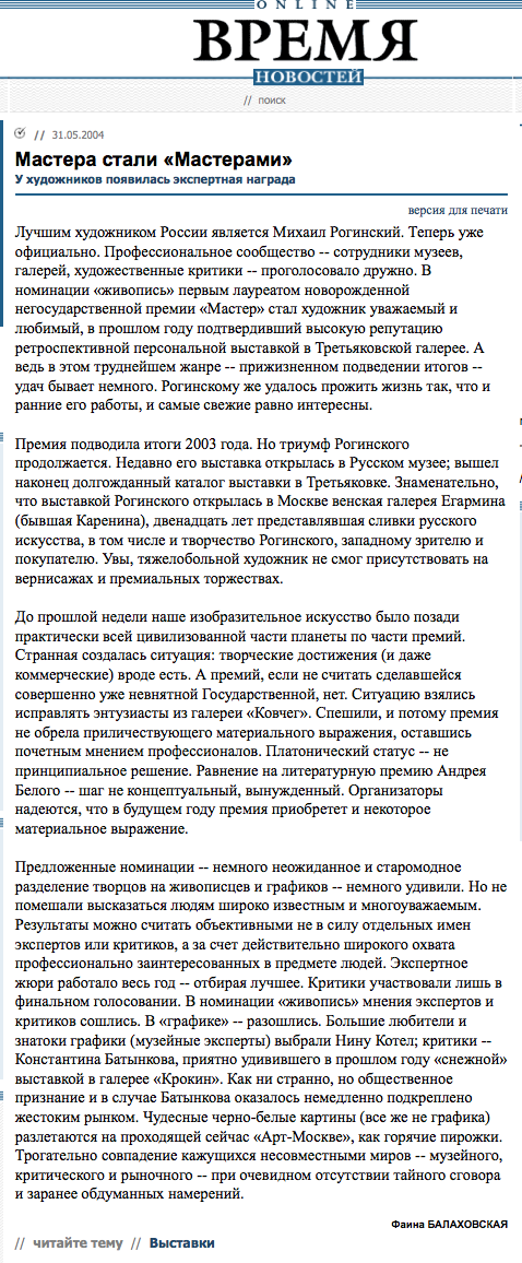 Премия подводила итоги 2003 года. Но триумф Рогинского продолжается. Недавно его выставка открылась в Русском музее; вышел наконец долгожданный каталог выставки в Третьяковке. Знаменательно, что выставкой Рогинского открылась в Москве венская галерея Егармина (бывшая Каренина), двенадцать лет представлявшая сливки русского искусства, в том числе и творчество Рогинского, западному зрителю и покупателю. Увы, тяжелобольной художник не смог присутствовать на вернисажах и премиальных торжествах.