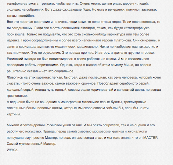 Михаил Александрович Рогинский ушел от нас. И мы опять осиротели, так и не оценив и его работу, его искусство. Правда, перед самой смертью московские критики и журналисты присудили ему премию Мастер, но ведь он сам всегда знал, и мы тоже знали, что он МАСТЕР. Самый мужественный Мастер.