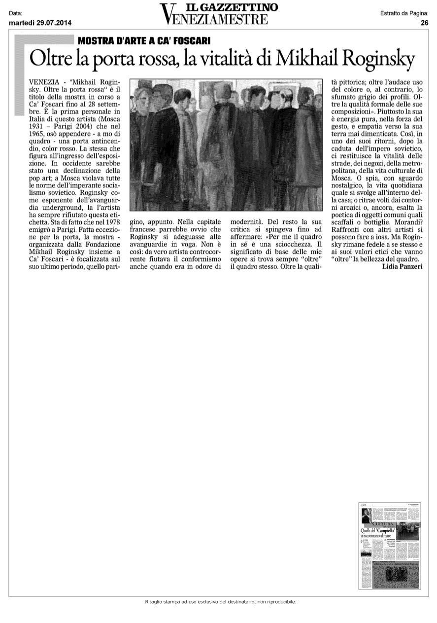 Lidia Panzeri, Oltre la porta rossa, la vitalità di Mikhail Roginsky, Il Gazzettino, 29.07.2014, Венеция