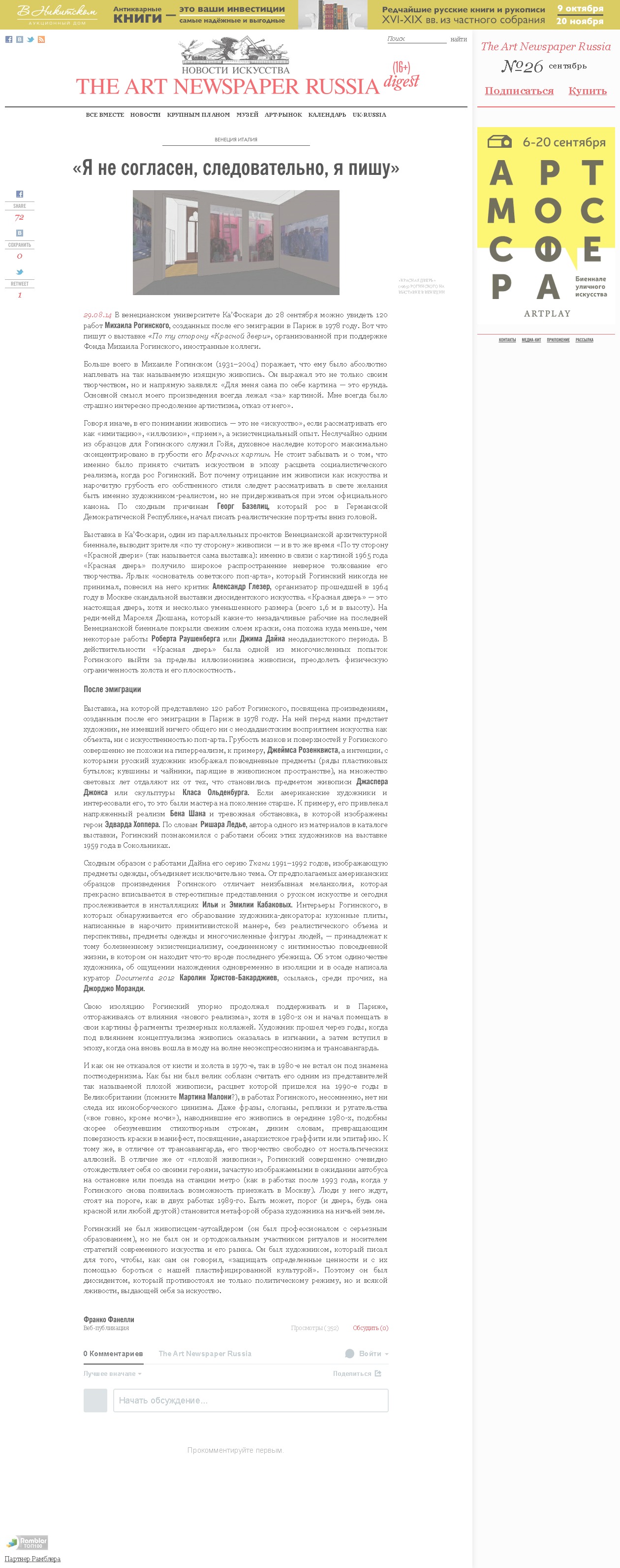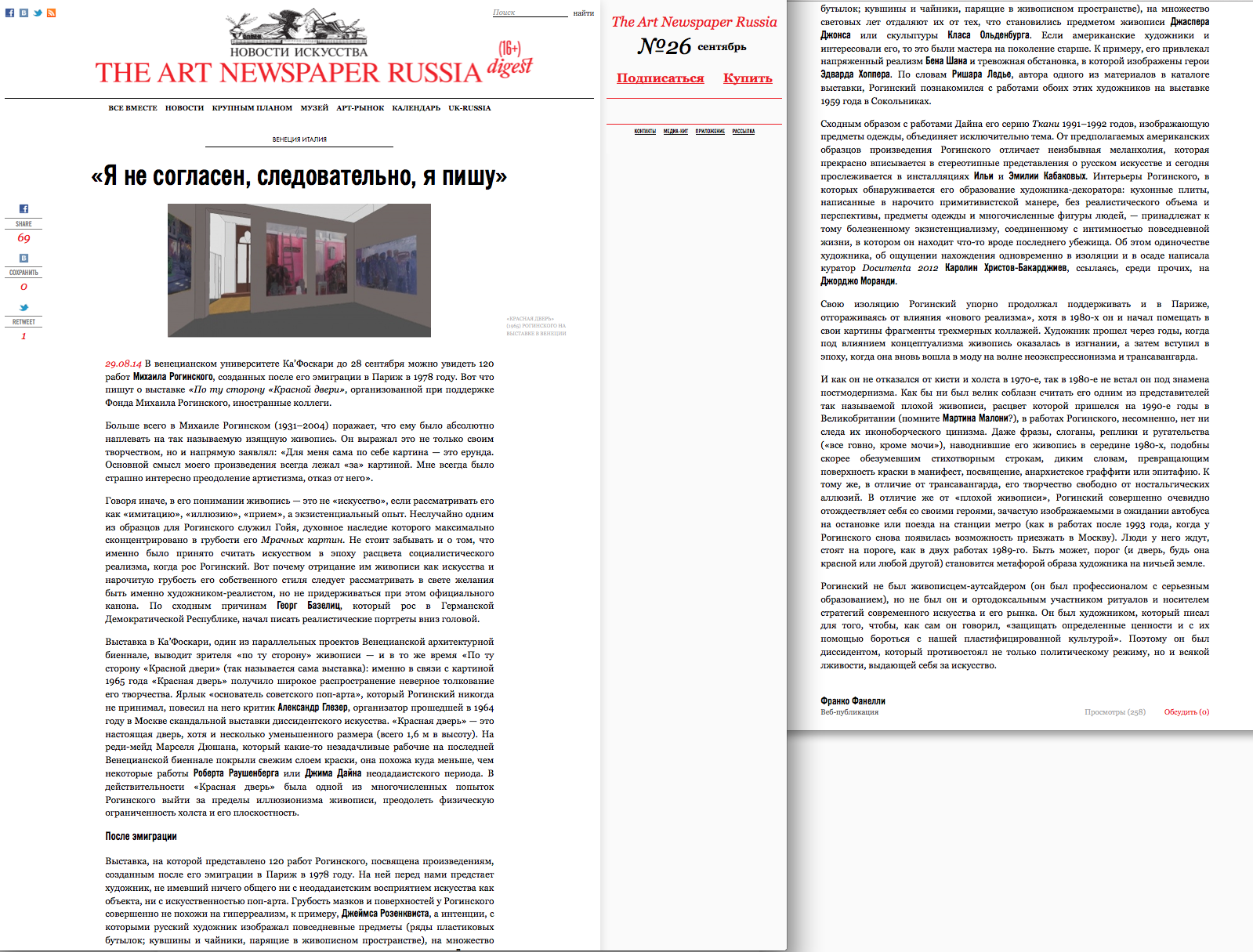 Franco Fanelli, "Я не согласен, следовательно, я пишу", The Art Newspaper Russia, 29.08.2014, 16+, Москва