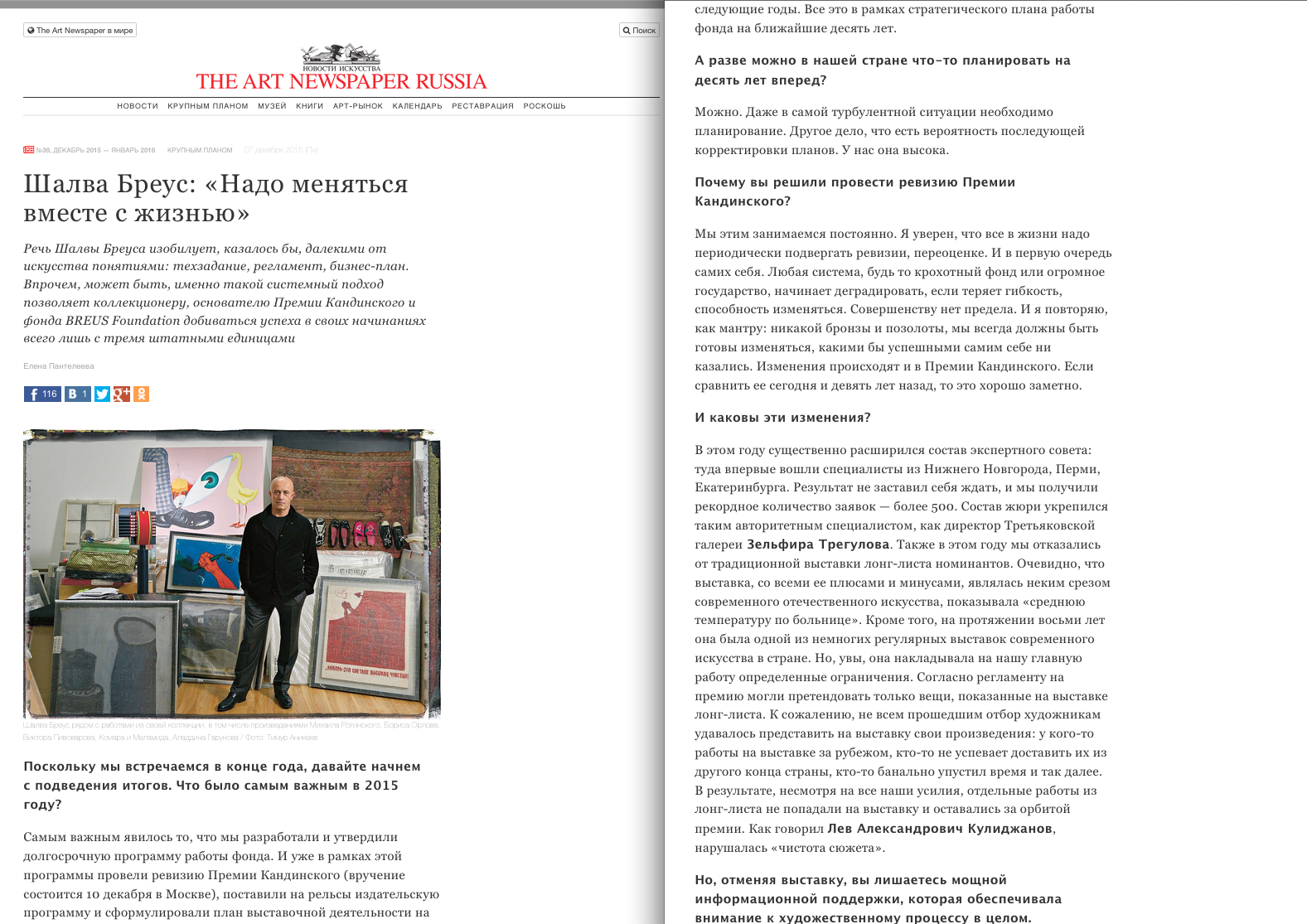 Шалва Бреус, Шалва Бреус: "Надо меняться вместе с жизнью", The Art Newspaper Russia, 2015, 39, Москва