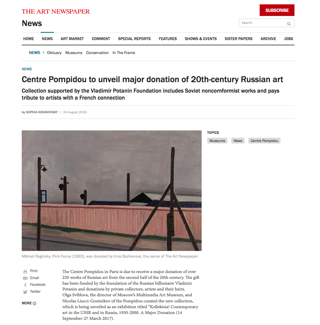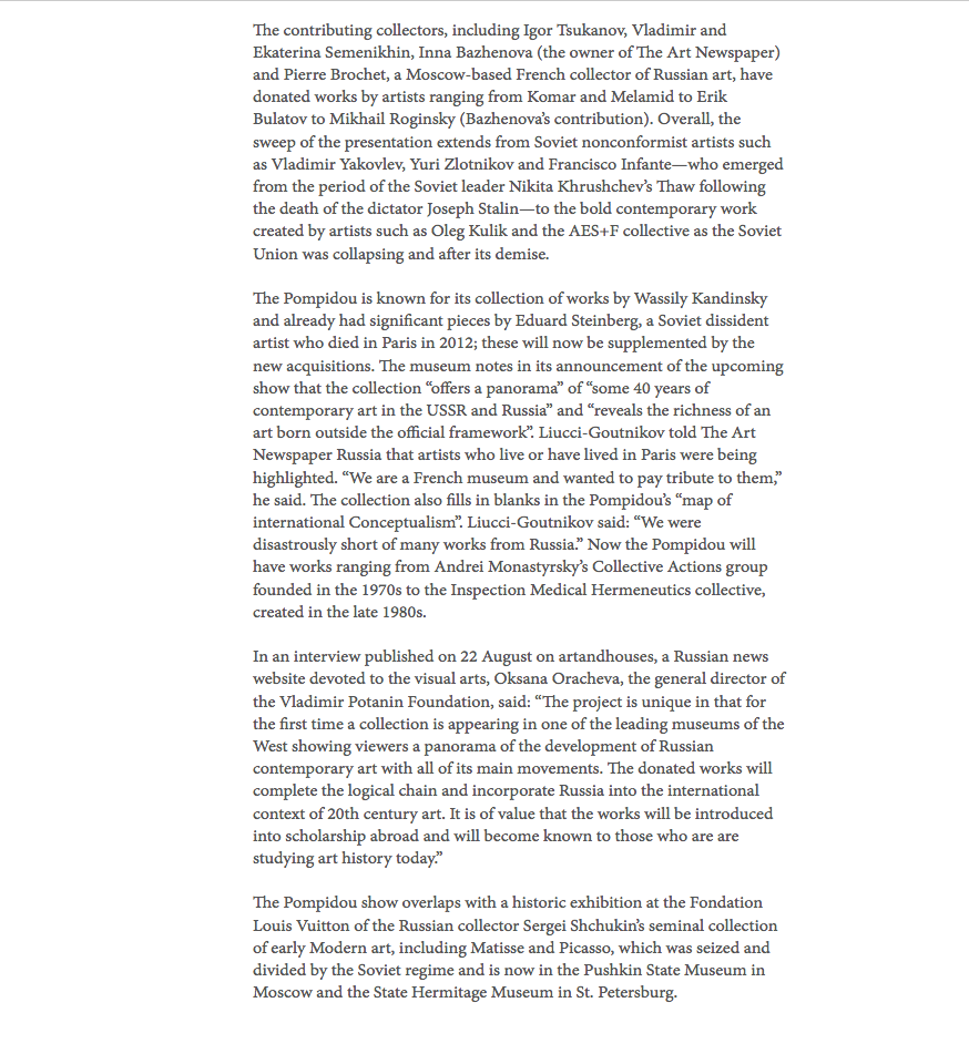 Sophia Kishkovsky, Centre Pompidou to unveil major donation of 20th-century Russian art, The Art Newspaper, 24.08.2016, Лондон