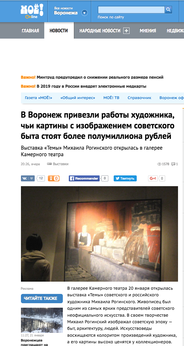 Ольга Гнездилова, В Воронеж привезли работы художника, чьи картины с изображением советского быта стоят более полумиллиона рублей, 23.01.2017, Воронеж